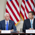 Vice President Mike Pence, left, accompanied by Vice-Chair Kansas Secretary of State Kris Kobach, right, speaks during the first meeting of the Presidential Advisory Commission on Election Integrity at the Eisenhower Executive Office Building on the White House complex in Washington, Wednesday, July 19, 2017. (AP Photo/Andrew Harnik)