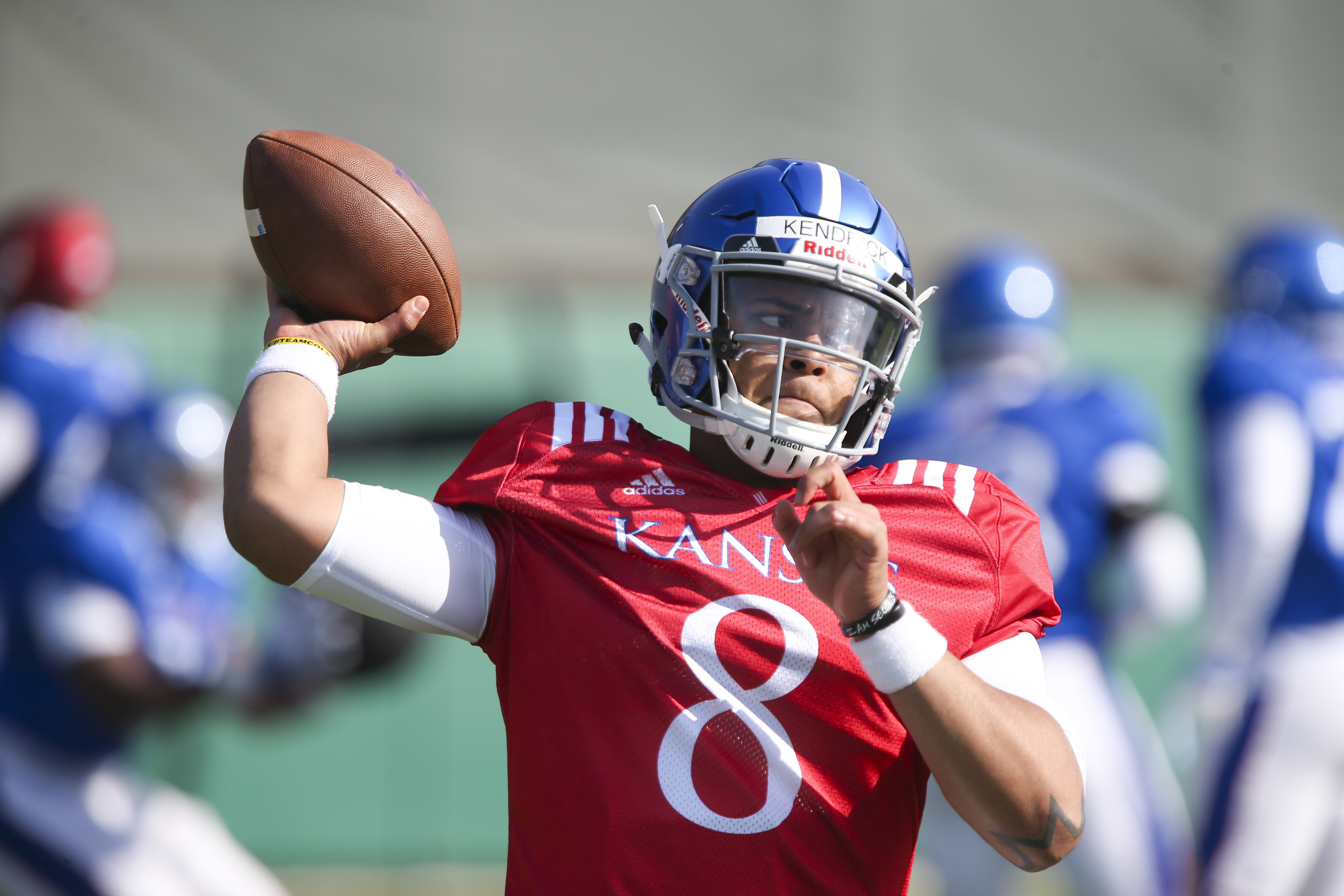 Kansas sophomore quarterback Miles Kendrick throws during practice on Wednesday, April 4, 2018.