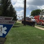 Lawrence-Douglas County Fire and Medical employees stand along 19th Street outside Fire Station 5 as the funeral procession for Fire Chief Mark Bradford passes by on July 31, 2018.