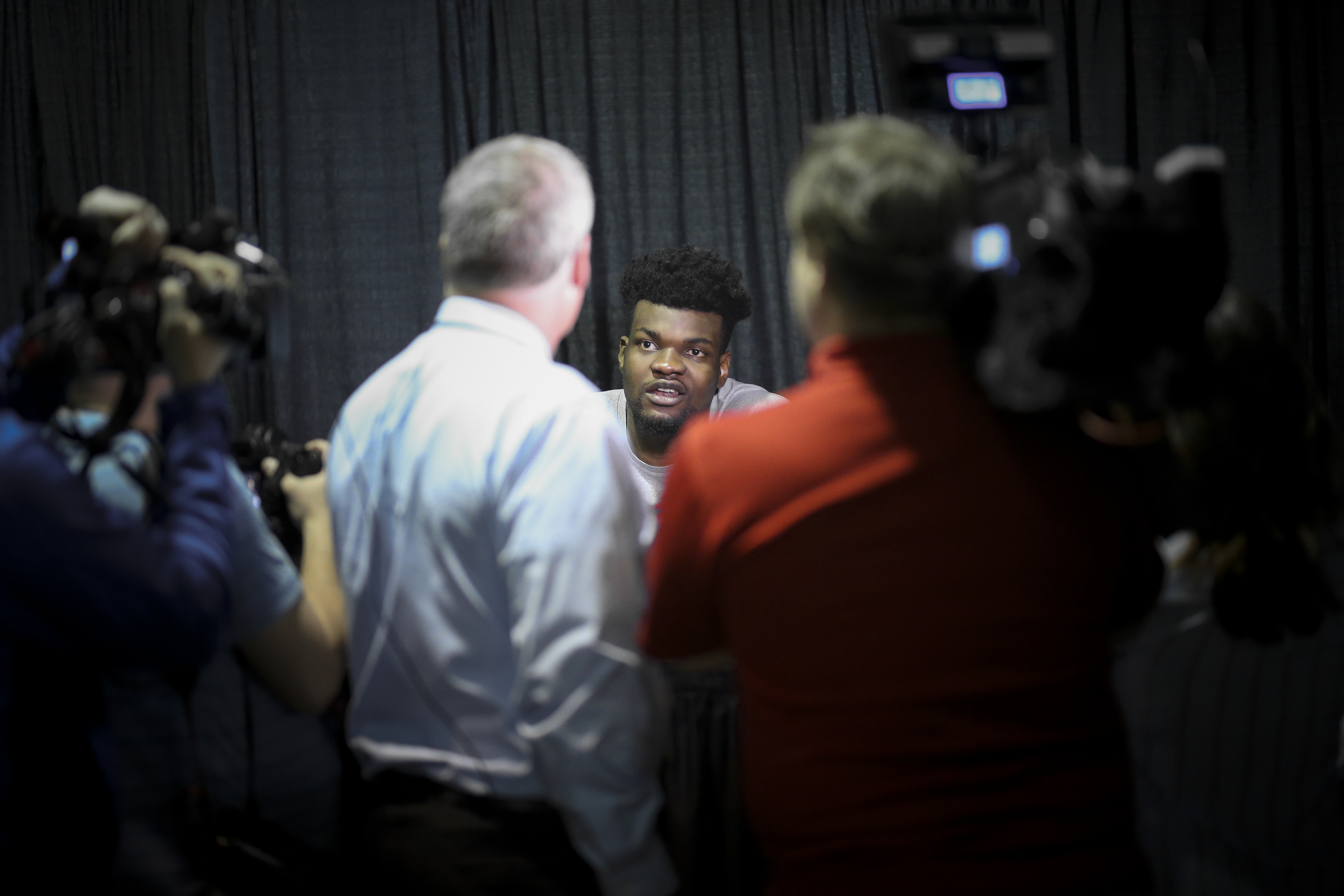 Kansas center Udoka Azubuike (35) talks with media members during a press conference on Saturday, March 24, 2018 at CenturyLink Center in Omaha, Neb.
