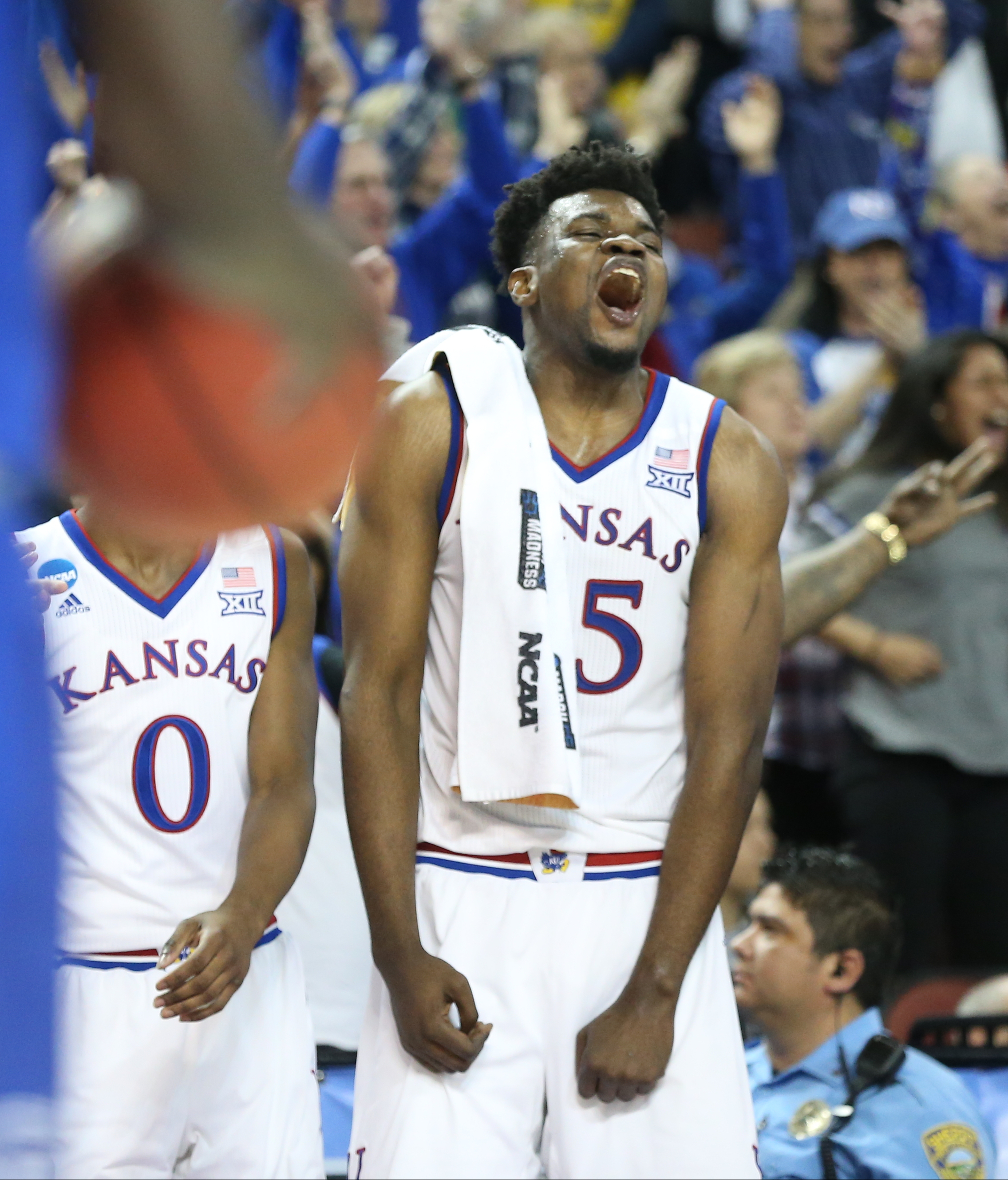 Kansas center Udoka Azubuike (35) goes wild on the bench after a three from Kansas guard Sviatoslav Mykhailiuk late in the second half, Saturday, March 17, 2018 in Wichita, Kan.