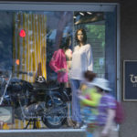 Passersby give a glance to a display window featuring a Norton motorcycle on Thursday, May 24, 2018 at Weaver's Department Store, 901 Massachusetts St.