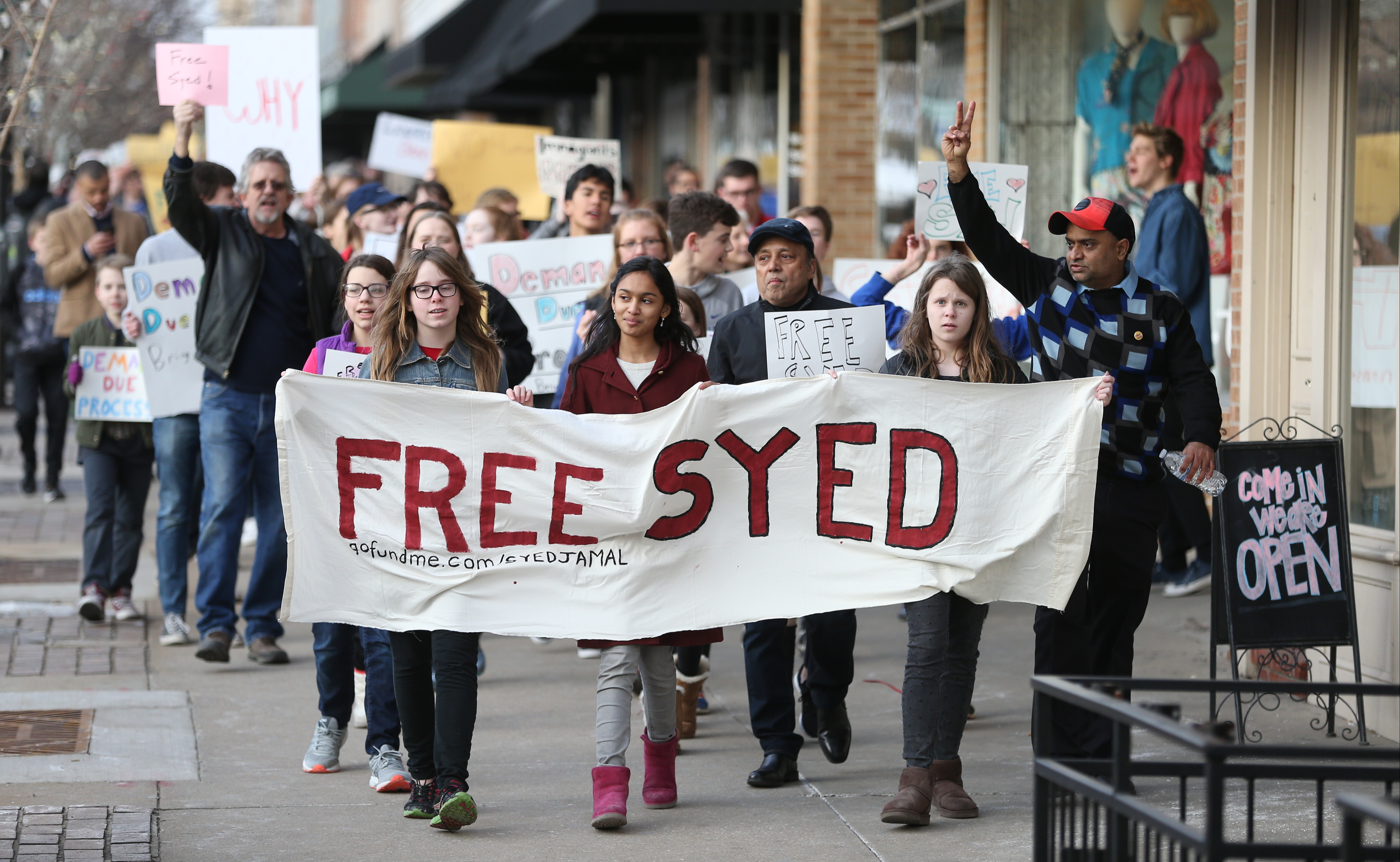 In this Journal-World file phone, Naheen Jamal, center, is flanked by her friends Elizabeth Anderson, left, and Anna Anderson as they lead a Free Syed Jamal march on Thursday, Feb. 8, 2018.