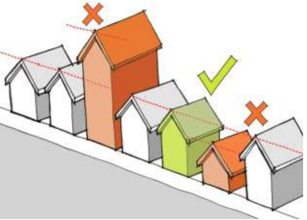The proposed code update also includes a fresh set of drawings that help explain the design criteria for new construction and additions to buildings in and around a historic structure or district, the type of work someone may be seeking a permit for. They illustrate requirements for elements like height, scale, setbacks and roof shapes.