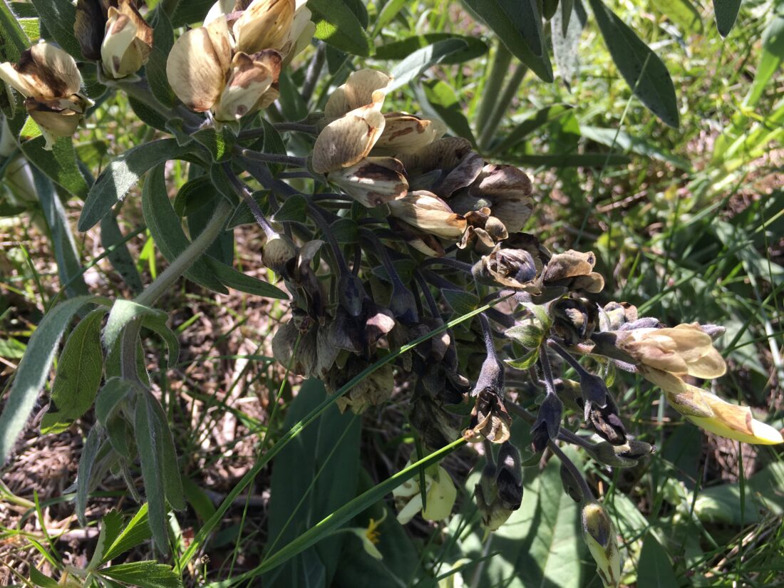 A cream wild indigo plant with browning leaves is pictured in the prairie behind the Prairie Park Nature Center on May 1, 2023.