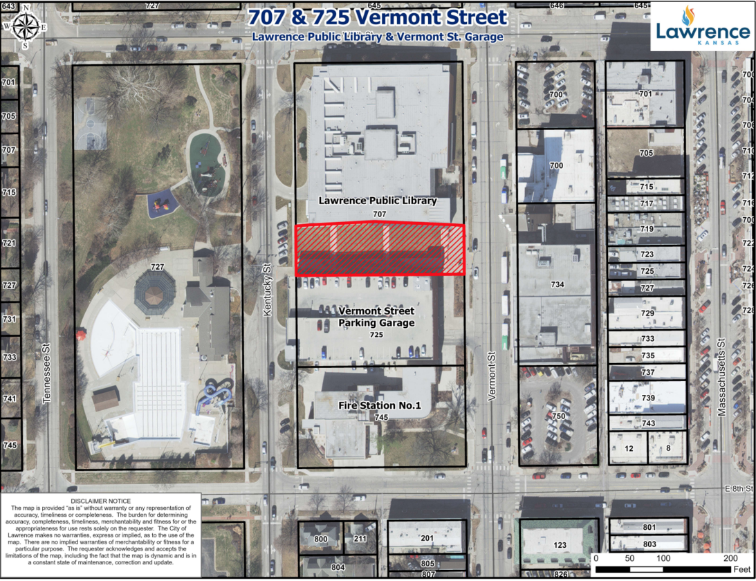 The grassy lawn next door to the Lawrence Public Library at 707 Vermont St., which is owned by City of Lawrence, is highlighted here in red. Under a draft lease agreement with the city approved by the Lawrence Public Library Board of Trustees, the library would be able to manage behavior problems outside the library building.