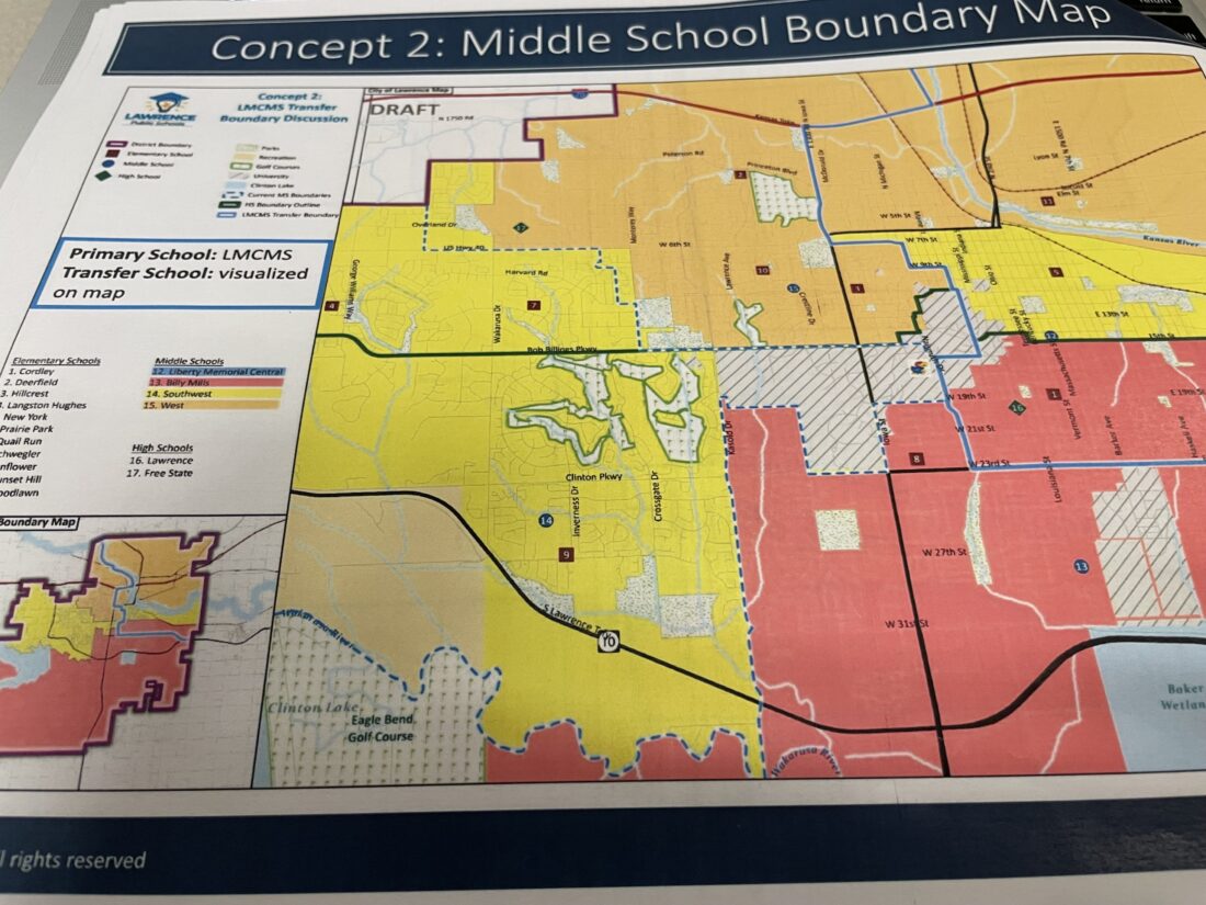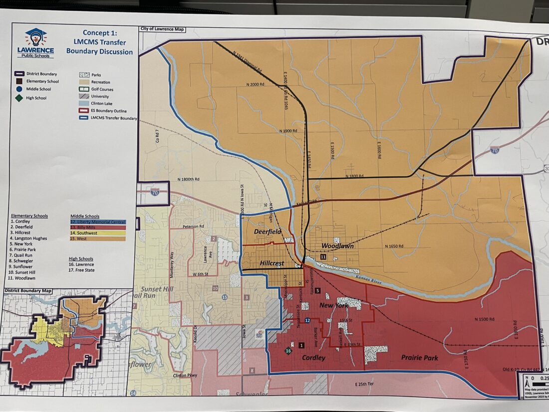 In the first concept, students in the LMCMS area who attended Cordley, New York or Prairie Park elementary schools and didn’t want to go to LMCMS would instead go to Billy Mills Middle School; those who attended Deerfield, Hillcrest or Woodlawn would go to West Middle School; and those who attended Quail Run Elementary would go to Southwest Middle School.