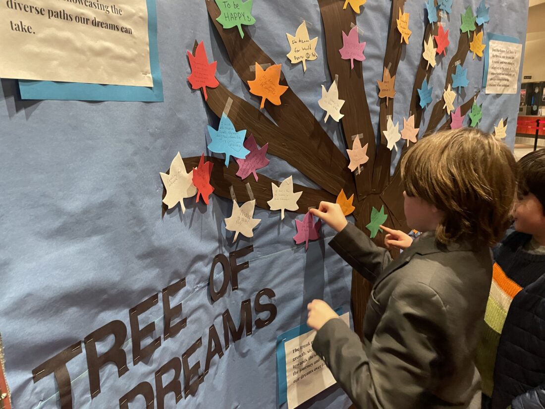 West Middle School student Owen Gillum places a cutout leaf containing a wish on the “Dream Tree” prior to the start of the district’s Martin Luther King Jr.-themed One Dream Celebration on Thursday, Jan. 18,, 2024, at Lied Center.
