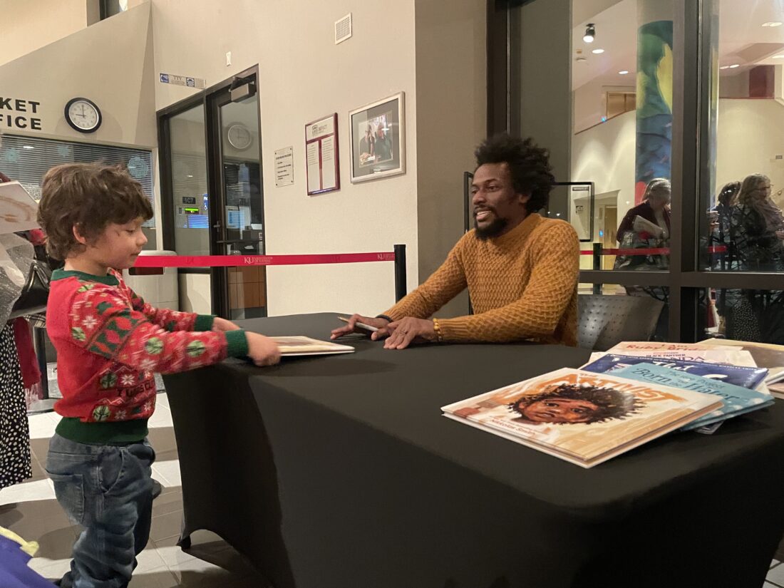 Artist Nikkolas Smith signs a copy of his children’s picture book “The Artivist” on Thursday, Jan. 18, 2024. Smith was the keynote speaker for Lawrence school district’s annual “One Dream Celebration” at the Lied Center.