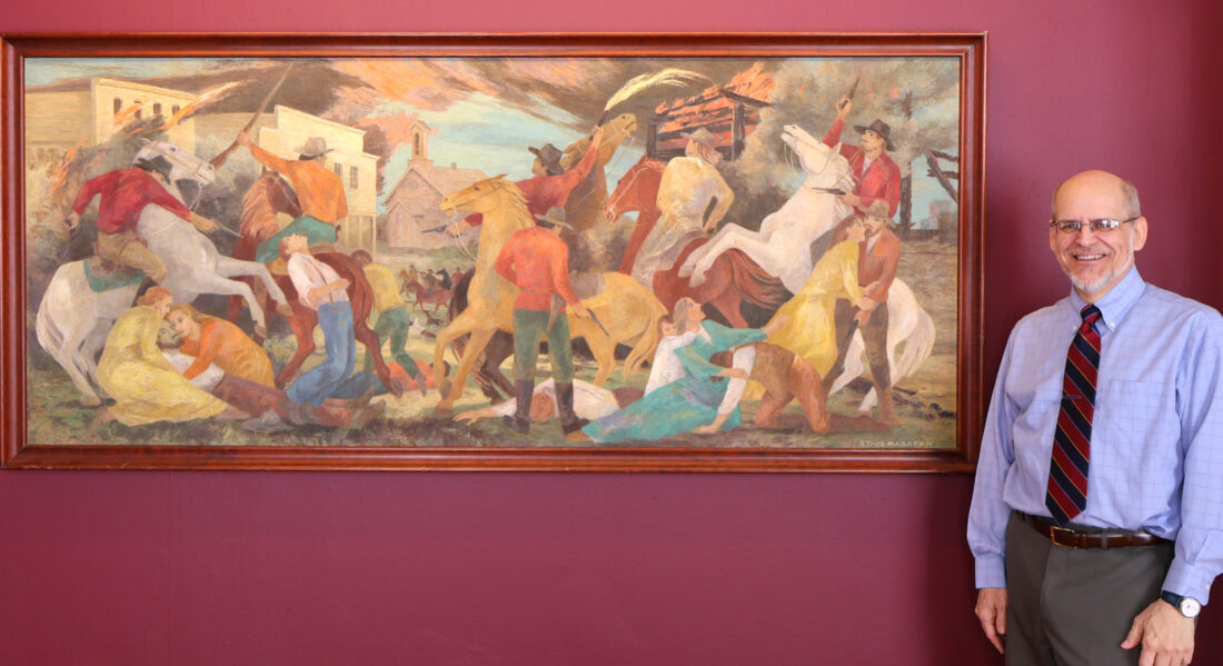 Watkins Museum Executive Director Steve Nowak is pictured on Thursday, Aug. 16, 2024, with “Lawrence Massacre” by Ethel Magafan which is on display at the Watkins Museum of History at 1047 Massachusetts Street.