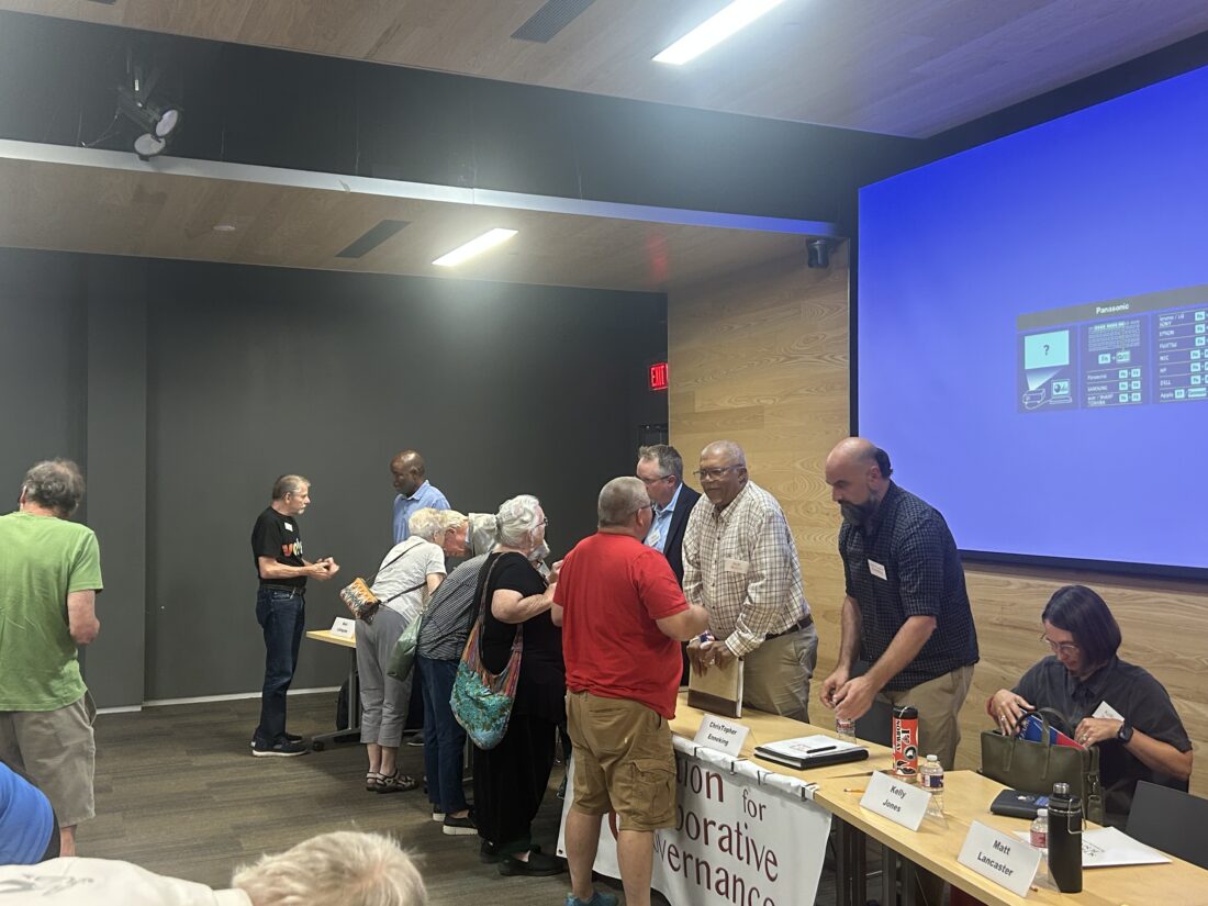 Holly Krebs, the lead organizer of the Coalition for Collaborative Governance, asked the candidates questions on three key topics: public engagement, collaboration between government entities and transparency. Krebs said the candidates had been given these questions ahead of time to formulate their answers. Additionally, each of the candidates answered questions submitted by members of the audience. Around 50 people were in attendance, and audience members were able to chat with candidates one-on-one afterward.