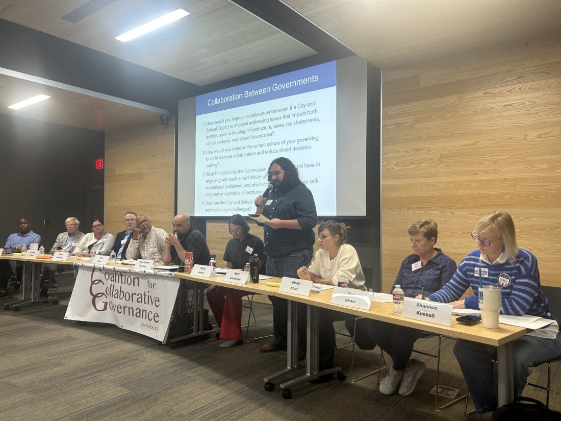 The Coalition for Collaborative Governance, a group of Lawrence residents that advocates for greater governmental transparency and community engagement, hosted the event at the Lawrence Public Library, 707 Vermont St.