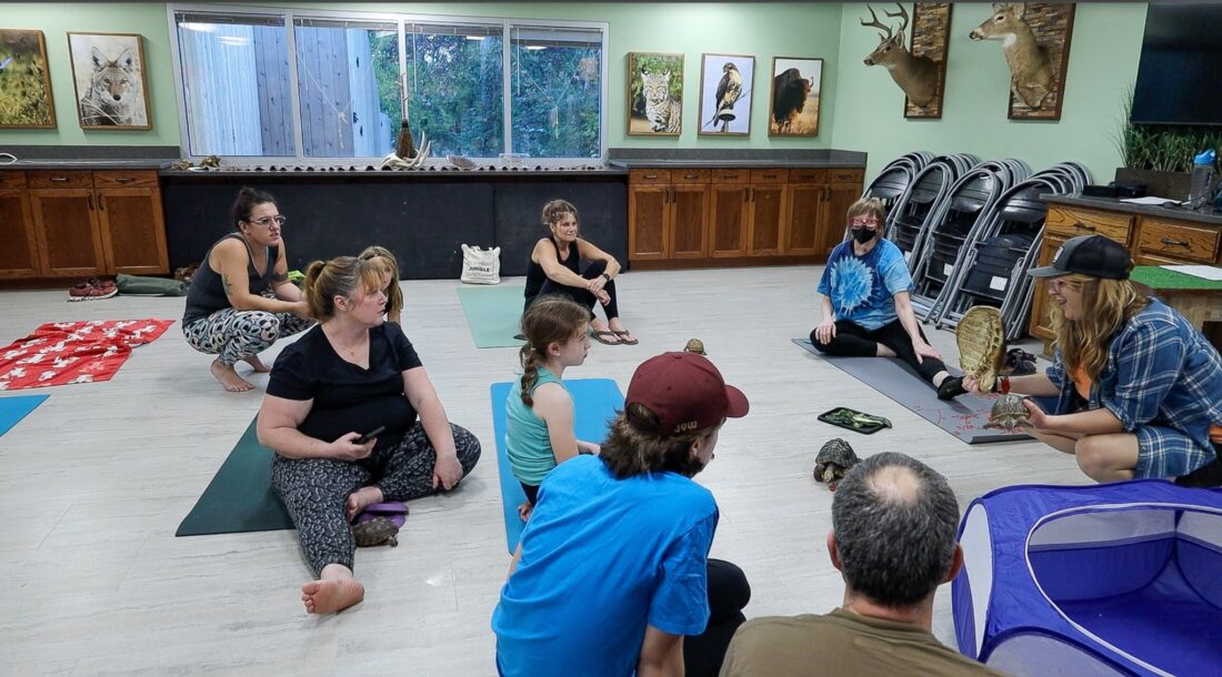 Each class includes 45 minutes of stretching and yoga time, with the turtles wandering around the participants. Detherage said occasionally, people are unsure about the whole program, but once the turtles come out they really get engaged with the program and the animals. In the final 15 minutes, the center’s naturalists bring out a little pool of warm water for the turtles, and the participants are able to feed and touch them while they learn more about the different varieties of turtles.