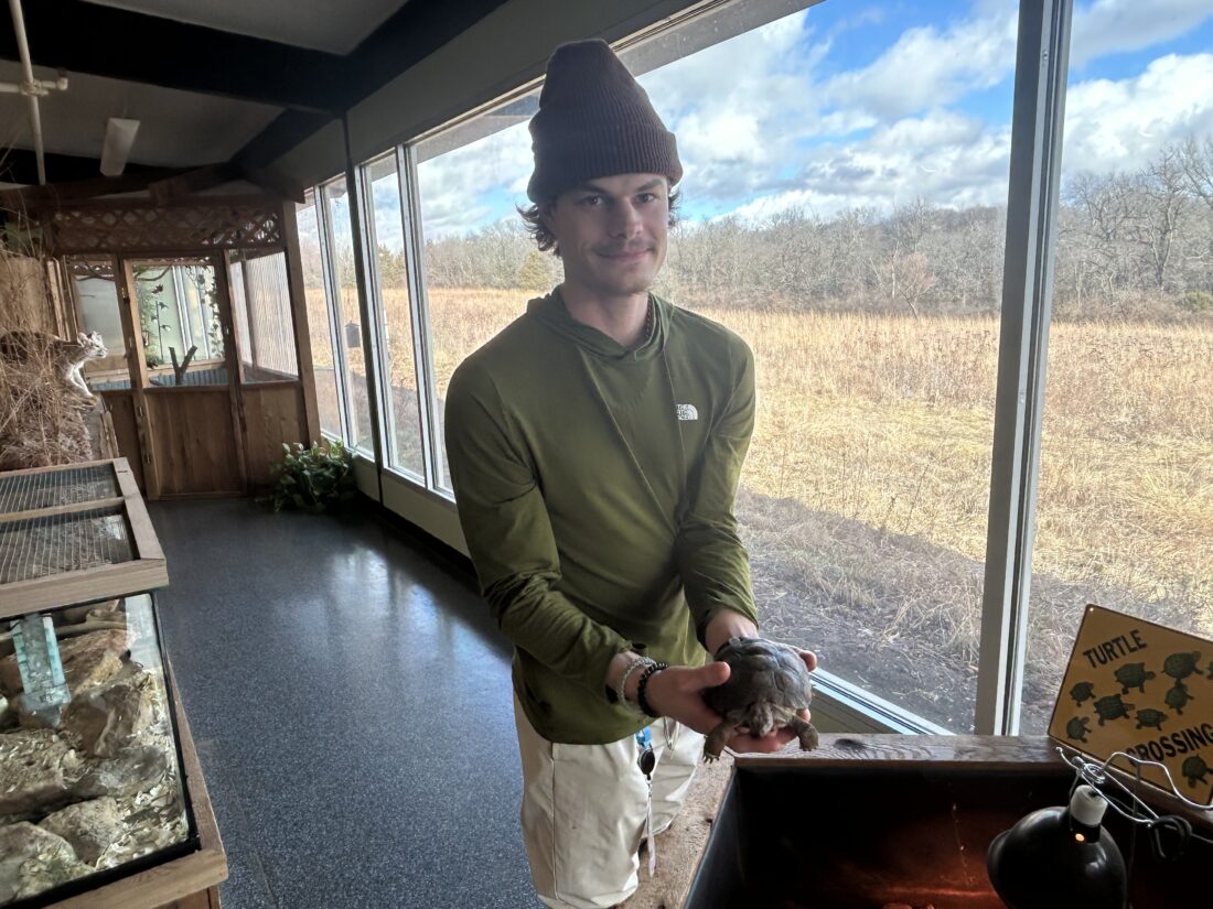 Clayton Detherage, a naturalist and nature programmer with Lawrence’s Prairie Park Nature Center, holding one of the turtles that will sometimes interact with participants during the center’s “Turtle Yoga” classes. Detherage said the classes are beneficial to both the humans and the turtles, who can become more socialized and relaxed from interacting in the classes.