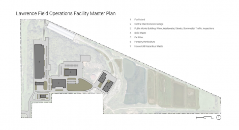 A facility master plan for the field operations campus on the project website includes seven structures or buildings, including a fueling station and central maintenance garage. Buildings for solid waste, facilities, forestry/horticulture, household hazardous waste and public works — including water, wastewater, streets, stormwater, traffic and inspections — are also included in the plan. City officials have said the headquarters would centralize operations and increase efficiency as well as address multiple issues with the city’s current facilities, in particular the multipurpose public works yard at the intersection of 11th Street and Haskell Avenue.