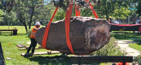 The 28-ton rock, which had stood in Robinson Park for nearly a century as a monument to the Lawrence’s founders, is being returned to the Native American tribe. Known as Iⁿ’zhúje’waxóbe, the rock was removed from its base earlier this week, as the Journal-World reported, and will be taken to tribal land in Council Grove.