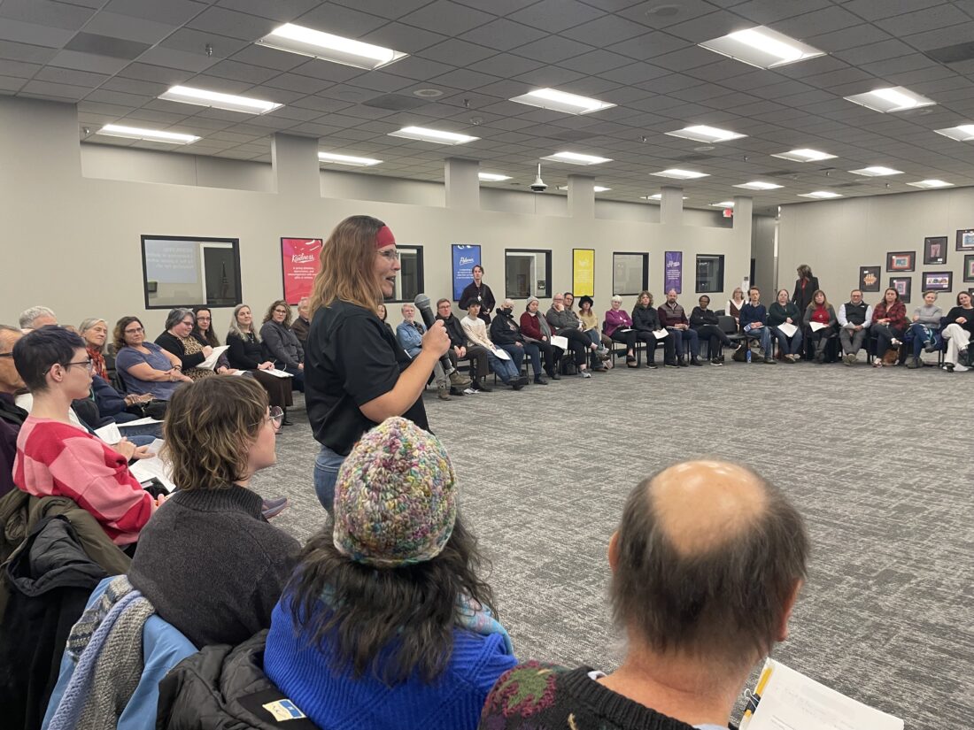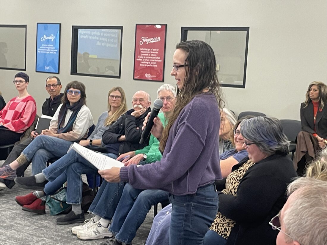 Holly Krebs speaks at “A Better Debate” on housing and homelessness on Thursday, Dec. 4, 2025, at the Lawrence school district offices.