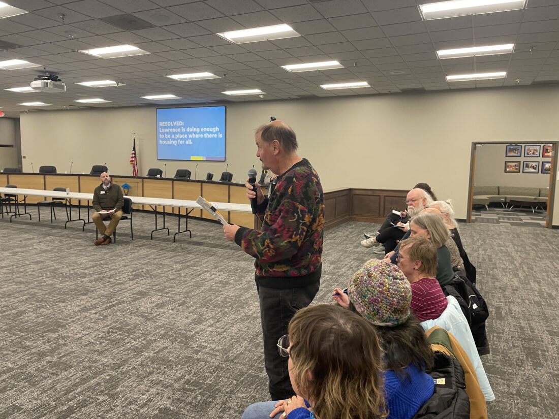 The debate – more of a discussion – was based on a new style that the Kansas Leadership Center is trying out, called “Braver Angels.” People could stand up along the circle, give their view on the question about whether Lawrence was doing enough on housing, and then answer a few follow-up questions from the other participants.
