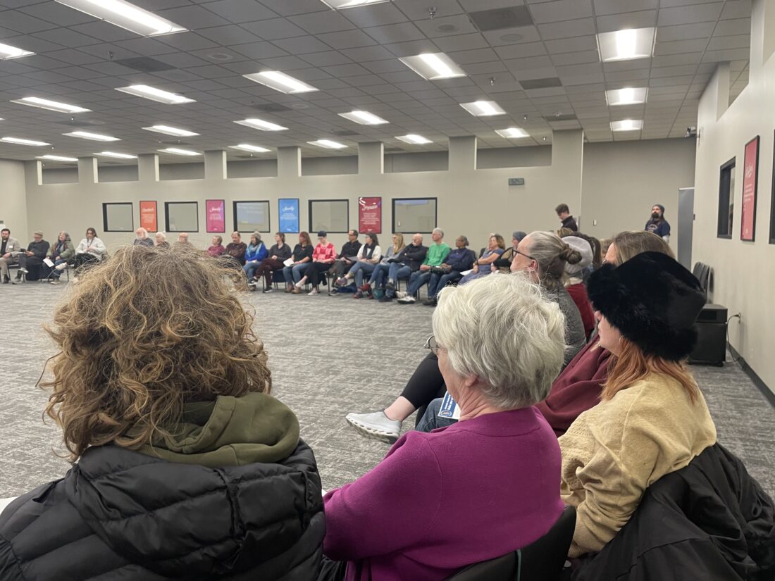 Participants sit in a circle at “A Better Debate” on housing and homelessness on Thursday, Dec. 4, 2025, at the Lawrence school district offices.
