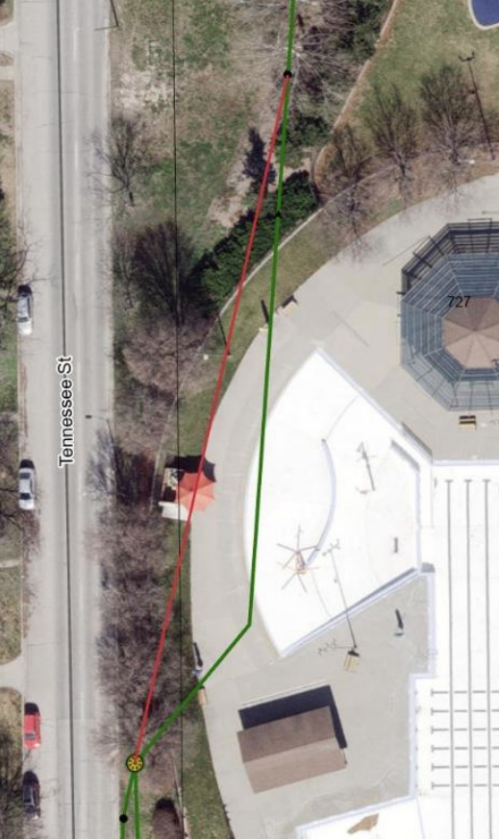The red line shows what the storm sewer route was believed to be at the start of the Tennessee Street construction. The green line that passes under the Outdoor Aquatic Center is its actual route, which was discovered later.