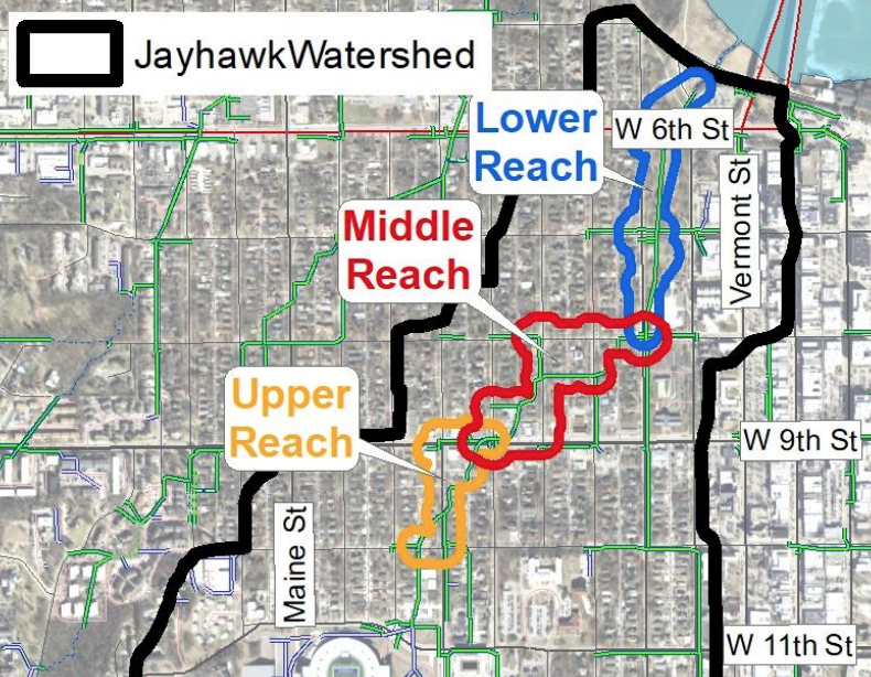 The three “reaches” of the Jayhawk Watershed. The city’s current stormwater projects are in the middle reach.