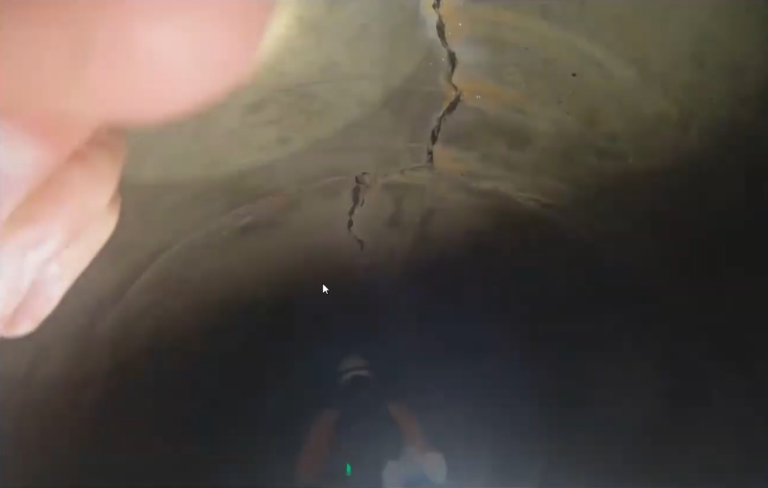 The crack is inside of a storm sewer tunnel that runs beneath Lawrence’s outdoor pool – specifically, beneath the zero-depth entry part of the pool whose structural problems spurred the city to approve a renovation project in 2024.