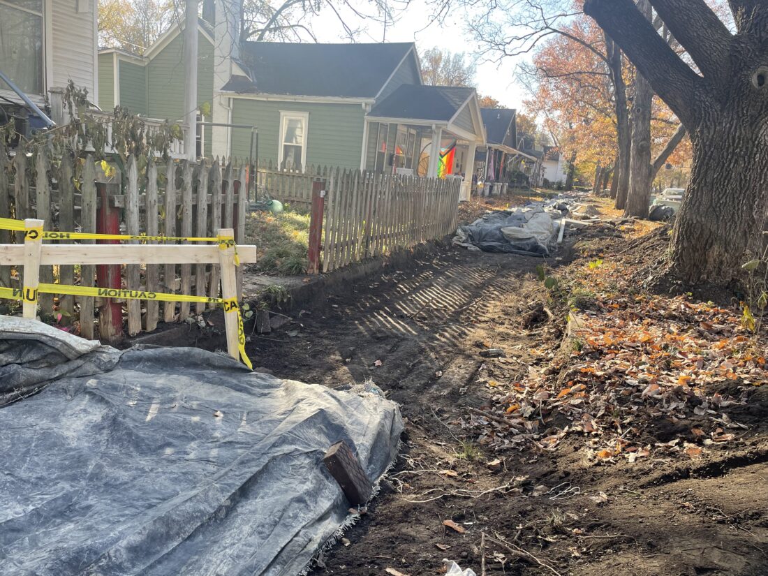 But the walk stops at a tarp laid across the sidewalk in the 900 block of Connecticut Street. Underneath is new concrete, and if you want to keep going, you have to walk on the lawns, past pallets of dusty old bricks wrapped in plastic.