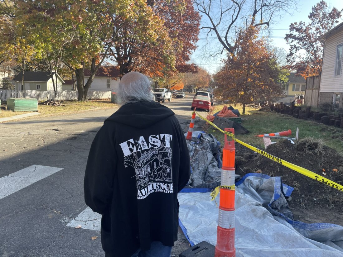 Barry Shalinsky, past president of the East Lawrence Neighborhood Association, points down Connecticut Street in the direction of concrete work on Friday, Nov. 14, 2025.