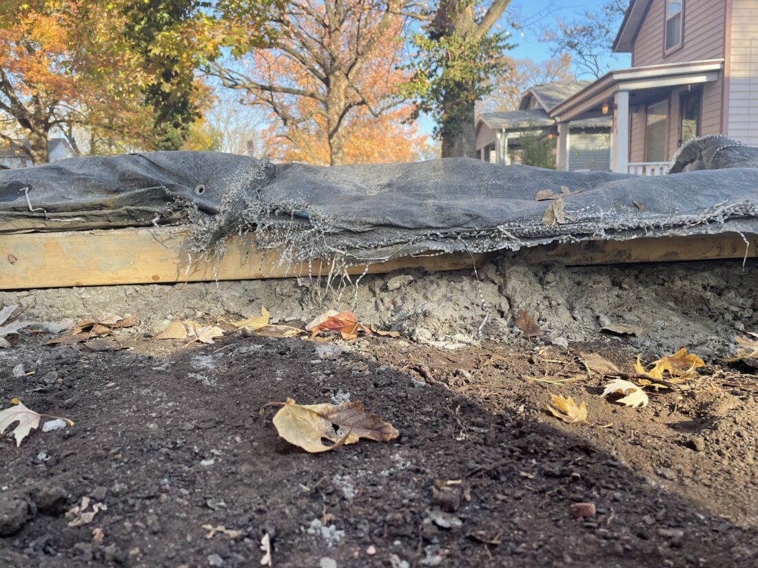 New concrete is covered with a tarp in East Lawrence on Friday, Nov. 14, 2025.