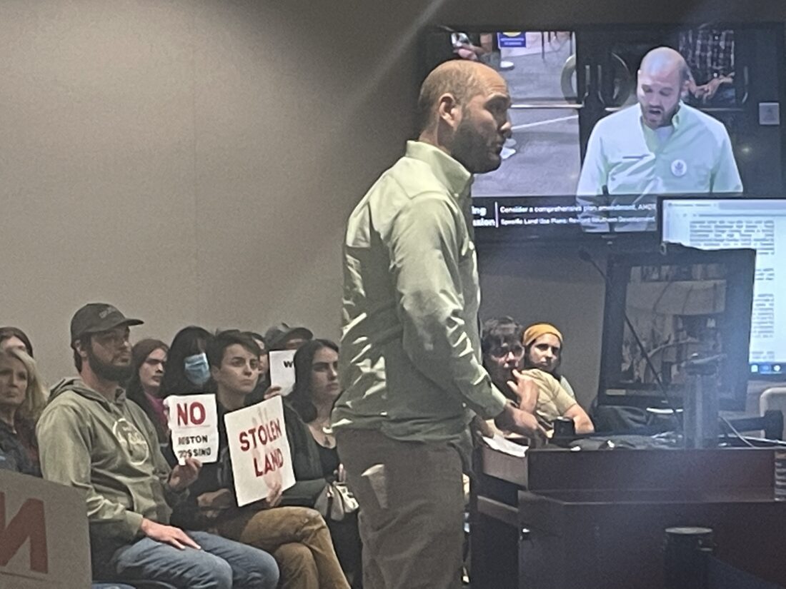 The crowd, which spilled out of the commission chambers into the overflow seats in City Hall’s lobby, spent more than an hour voicing its frustration with New Boston Crossing and urging commissioners not to recommend the request for approval. People carried signs like “NO BOSTON CROSSING,” “STOLEN LAND” and “WATER IS LIFE,” and many of them spoke emotionally to commissioners about their personal connections to the nearby Baker Wetlands.
