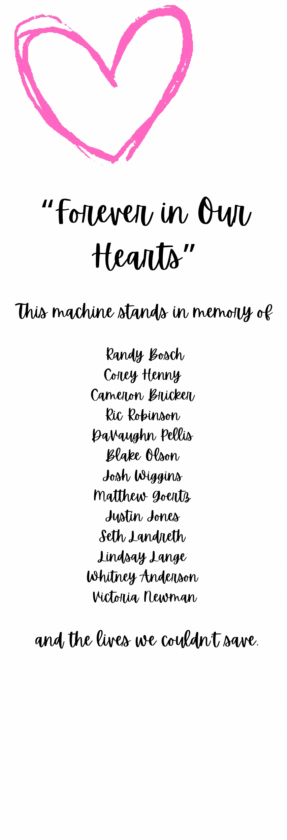 An example of one of the sticker designs that will go on Lawrence’s naloxone vending machines. The stickers will feature the names of people who died of overdoses; this one’s list includes Randy Bosch, Misty Bosch-Hastings’ father.