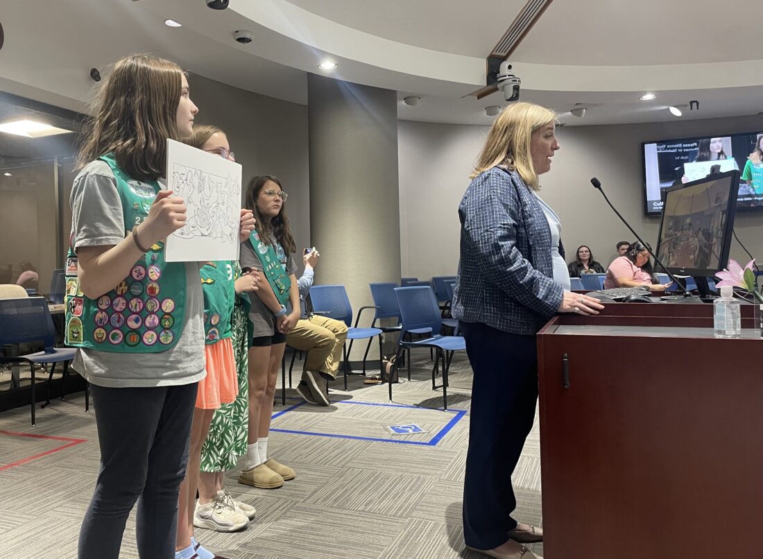 Junior Girl Scouts from Troop 2858 and their leader, Meryl Carver-Allmond, present their mural design to the Lawrence Cultural Arts Commission on Wednesday, April 8, 2026.