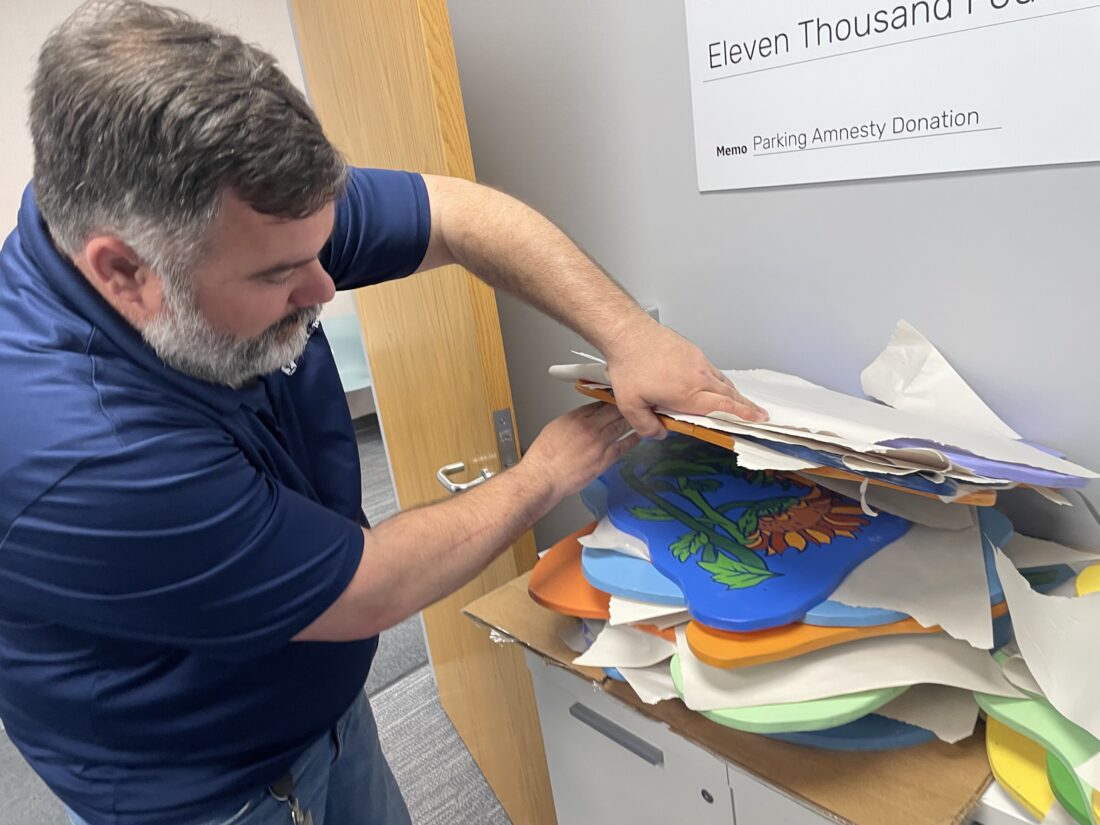 Parking manager Brad Harrell looks through a stack of markers created by the student art group Hang12 on Friday, April 10, 2026.