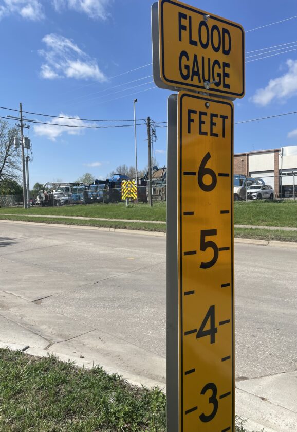 A flood gauge outside the city’s MSO buildings near 11th and Haskell is pictured on Tuesday, April 14, 2026. The area is near the Burroughs Creek and is at risk of flooding.