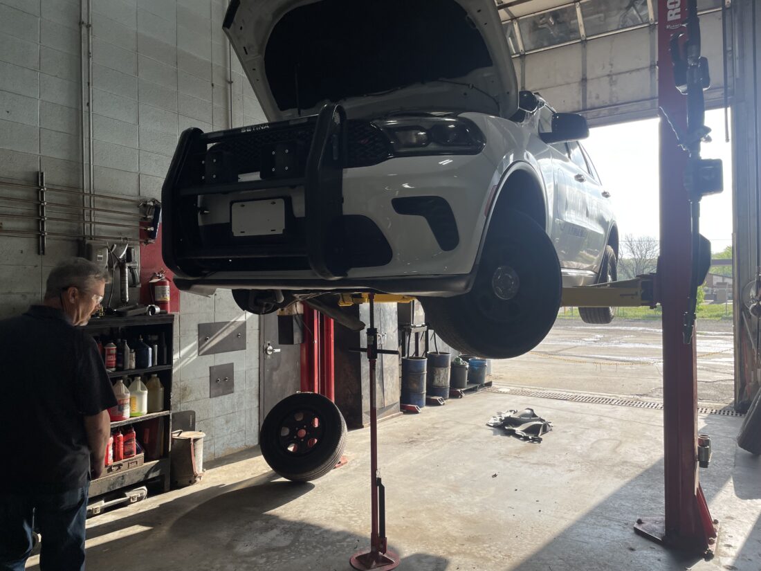 Robert Aaron, the MSO fleet manager, stands by a police car in one of the light vehicle bays in the central maintenance garage on Tuesday, April 14, 2026.