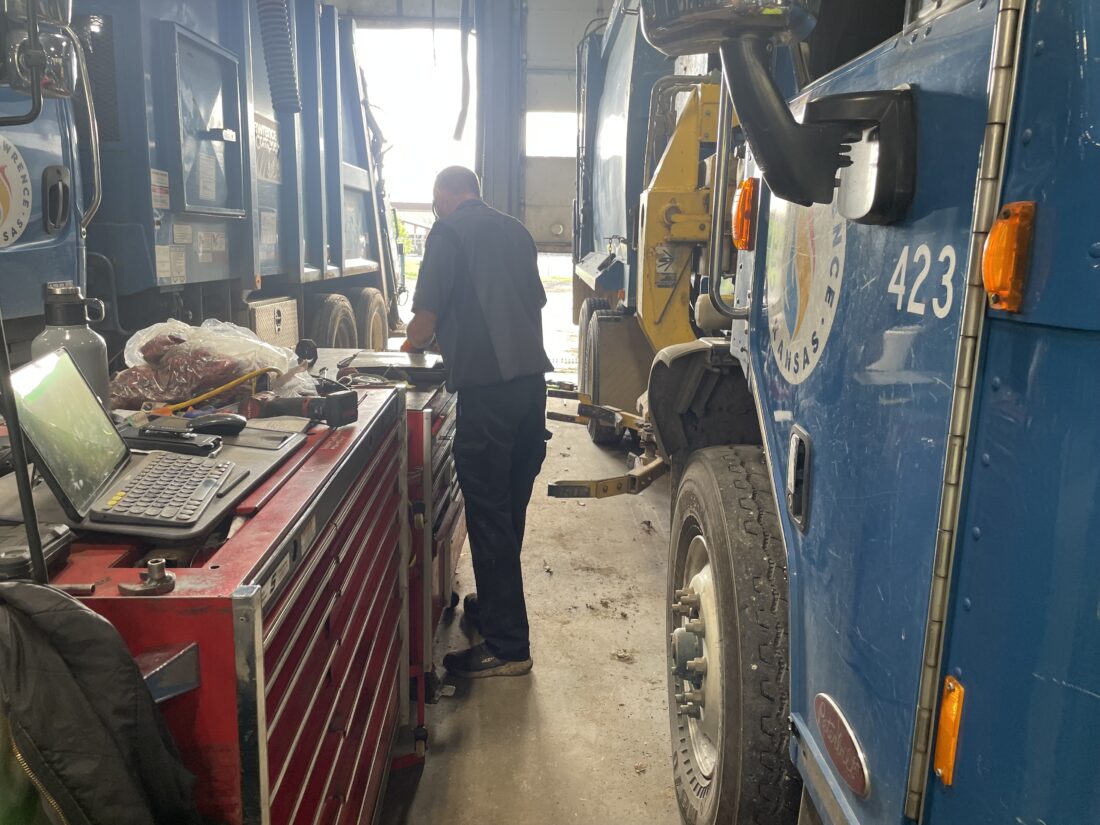 Not just every trash truck, but all of the city’s more than 800 pieces of rolling stock get serviced at the central maintenance garage, across the street from the Solid Waste building near 11th and Haskell.