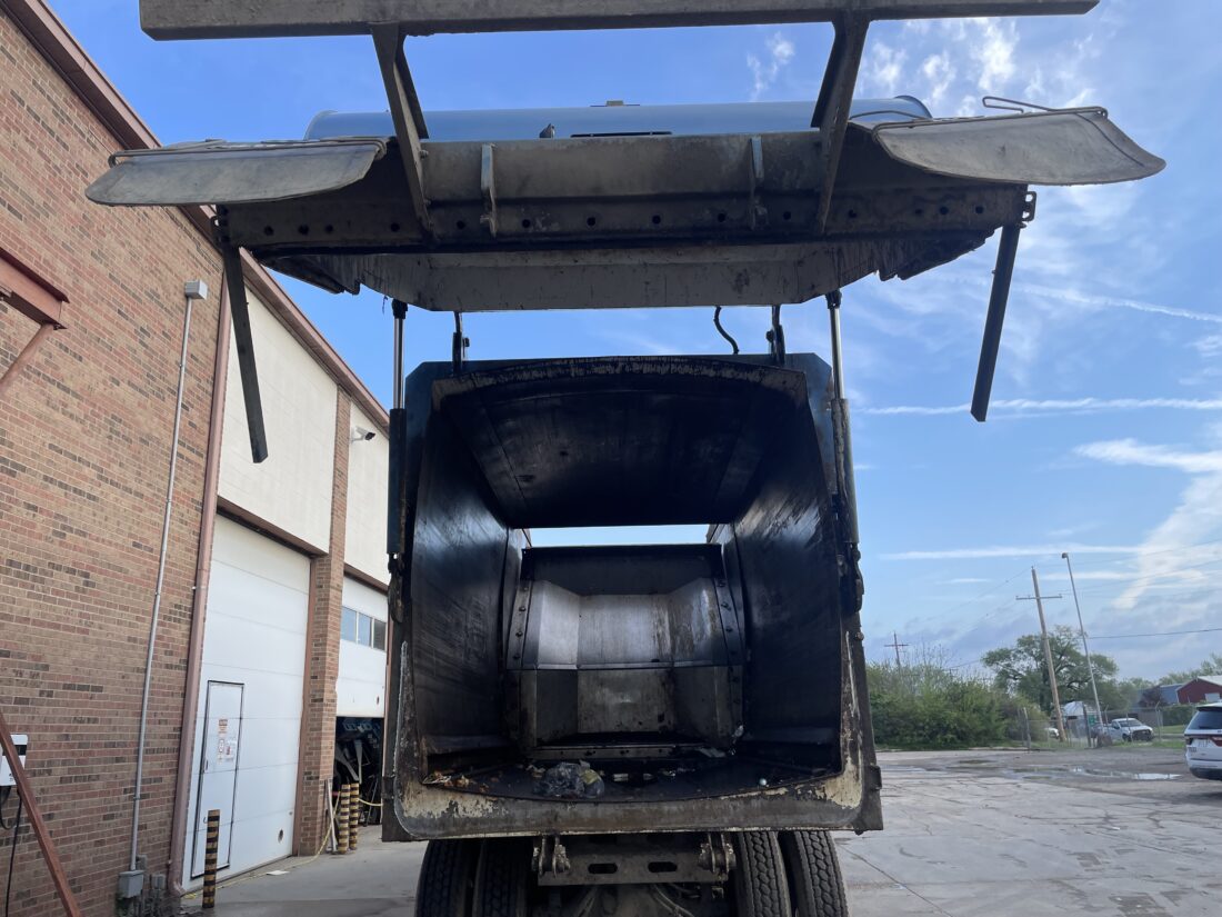 A garbage truck is parked outside the central maintenance garage on Tuesday, April 14, 2026.