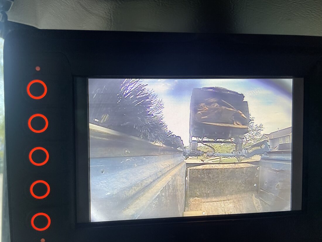 A screen inside of Tim Reeves’ truck shows trash as it’s dumped into the hopper.