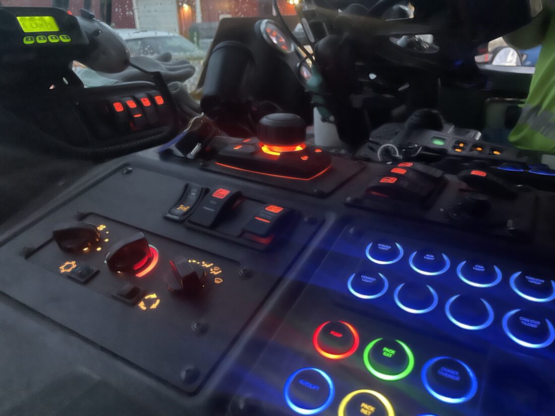They’re also outfitted with a sensor that can read the RFID tags embedded in customers’ carts. When Reeves tips a trash cart into the truck, it goes past the sensor, which reads it, and there’s a “ding” noise to let him know it scanned.