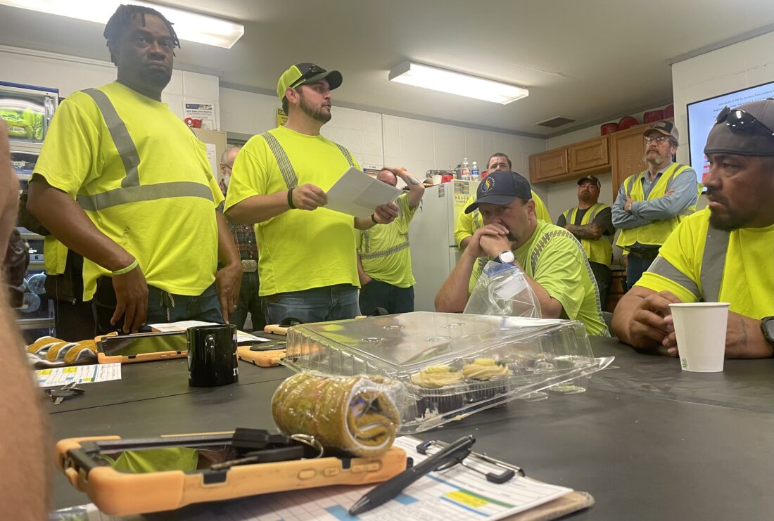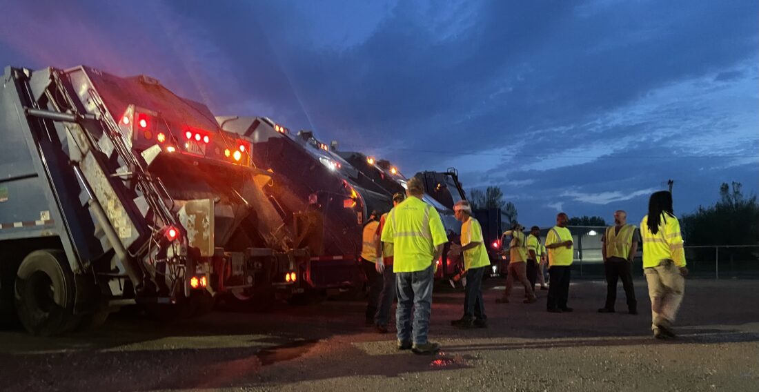 A crowd of workers listens to the morning briefing in the break room of the Solid Waste building on Tuesday, April 14, 2026.