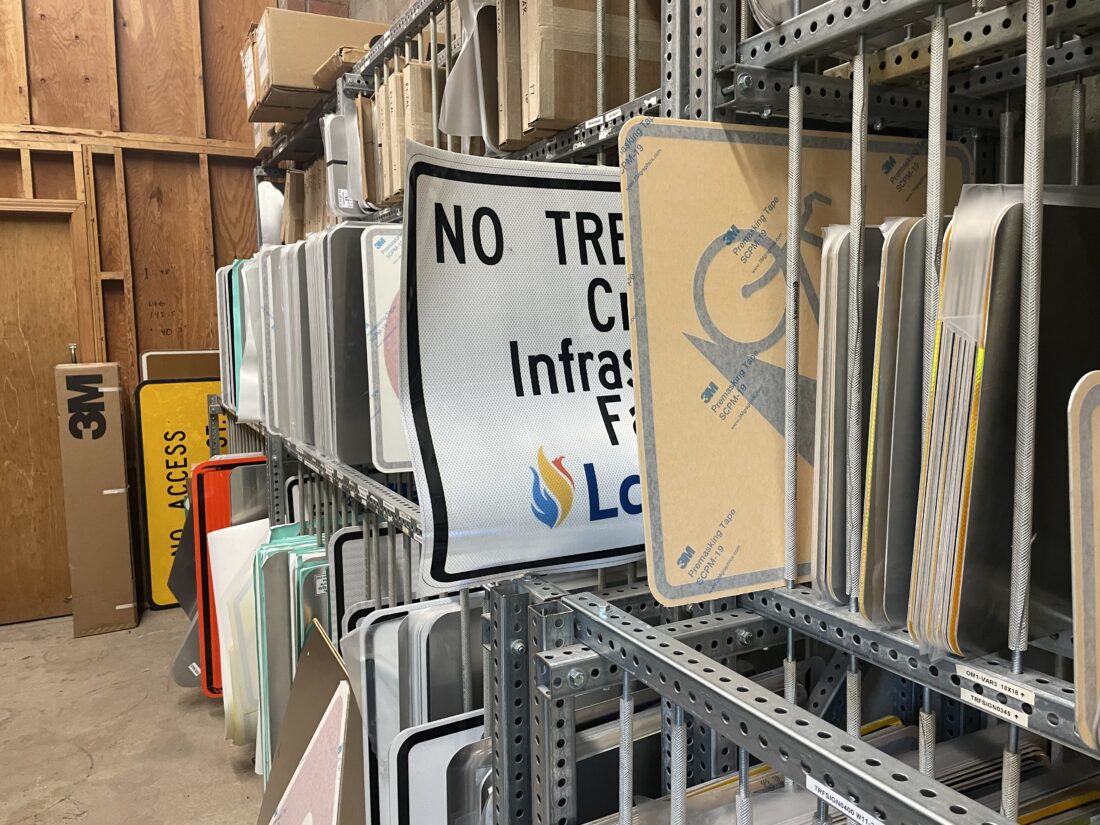 Rows of signs at the city’s traffic building in the Pinkney neighborhood are pictured on Tuesday, April 14, 2026.