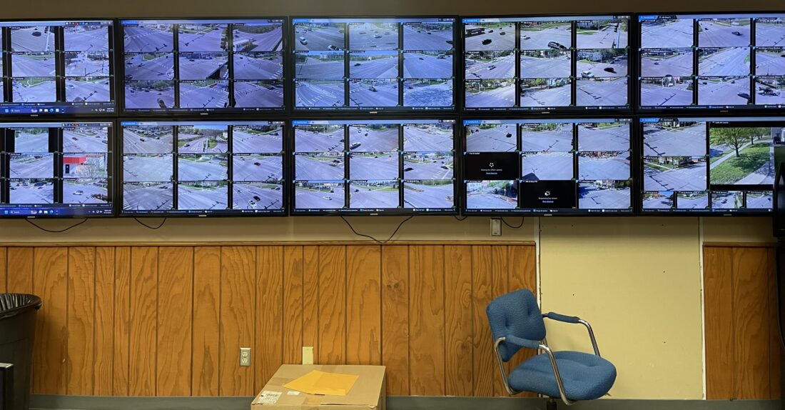 A bank of screens is pictured on Tuesday, April 14, 2026, in the city’s traffic building in the Pinkney neighborhood.