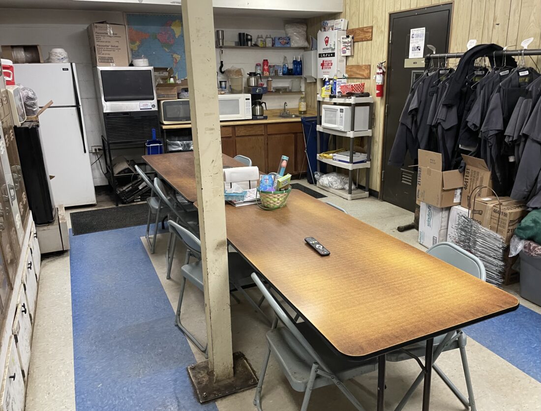 This is a combination locker room/break room at the city’s central maintenance garage. The door to the bathroom is on the right.