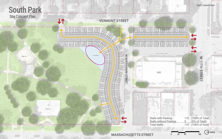 For the South Park site, Clark spoke of two potential concepts. One would take up about 10% of the park and would also occupy space in what’s now the parking lot of the Community Building, 115 W. 11th St. Another plan would not use any space in the Community Building lot and would extend the space for vendors and parking farther south into the park.