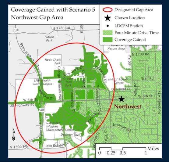 Northwest Lawrence is one of the gaps on that four-minute drive time map. Among the places the department says it can’t respond to in four minutes are Rock Chalk Park, the Sixth Street and South Lawrence Trafficway interchange and the SLT and Kansas Turnpike interchange. But with Station 6, all of those locations would be in the four-minute coverage area.