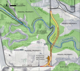 This map shows the conceptual road alignment, right-of-way and anticipated environmental factors of a proposed project to extend Wakarusa Drive south of Lawrence and build a bridge over the Wakarusa River.