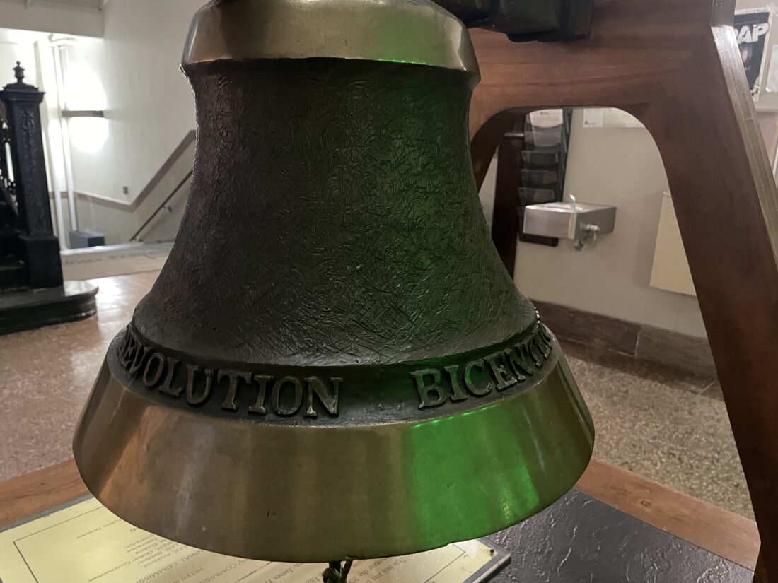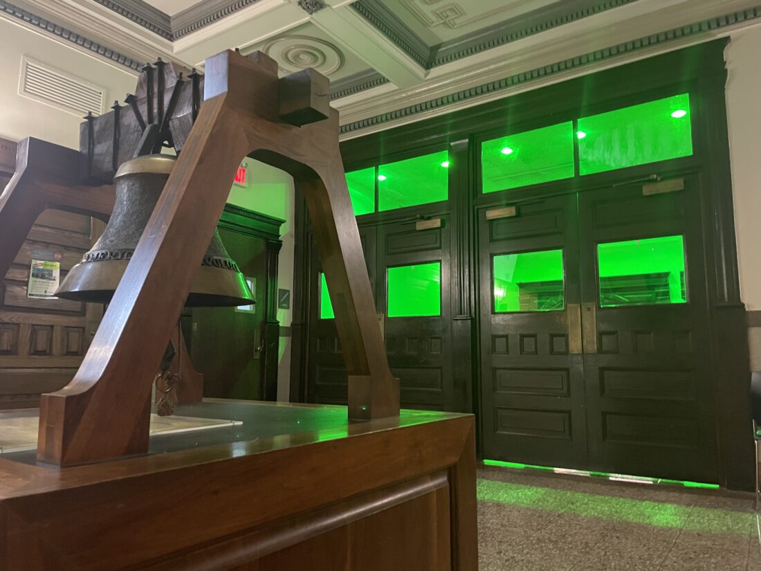 Green lights for Operation Green Light for Veterans reflect off of the bell in the lobby of the Douglas County courthouse on Wednesday, Nov. 5, 2025.