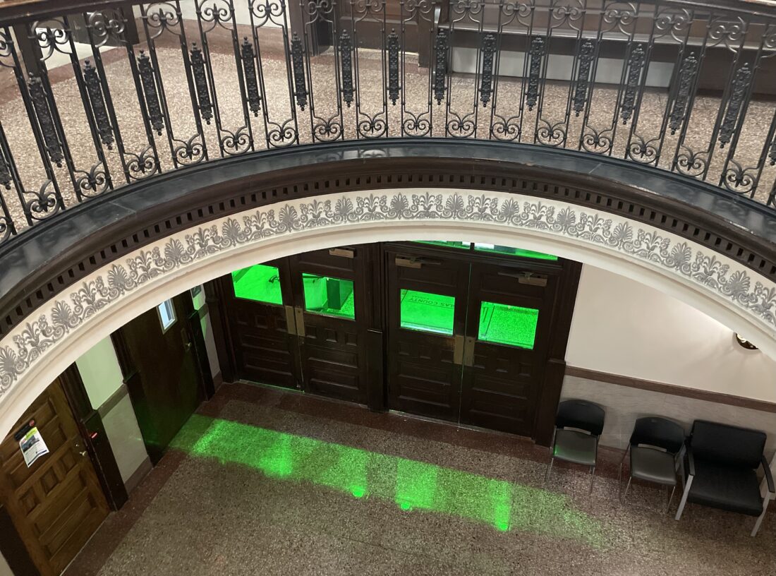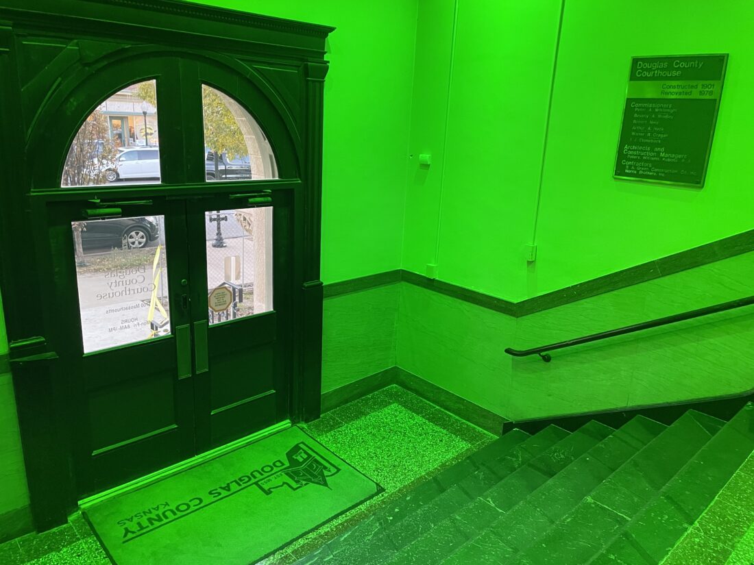 Green light shines into the lobby of the Douglas County courthouse on Wednesday, Nov. 5, 2025.