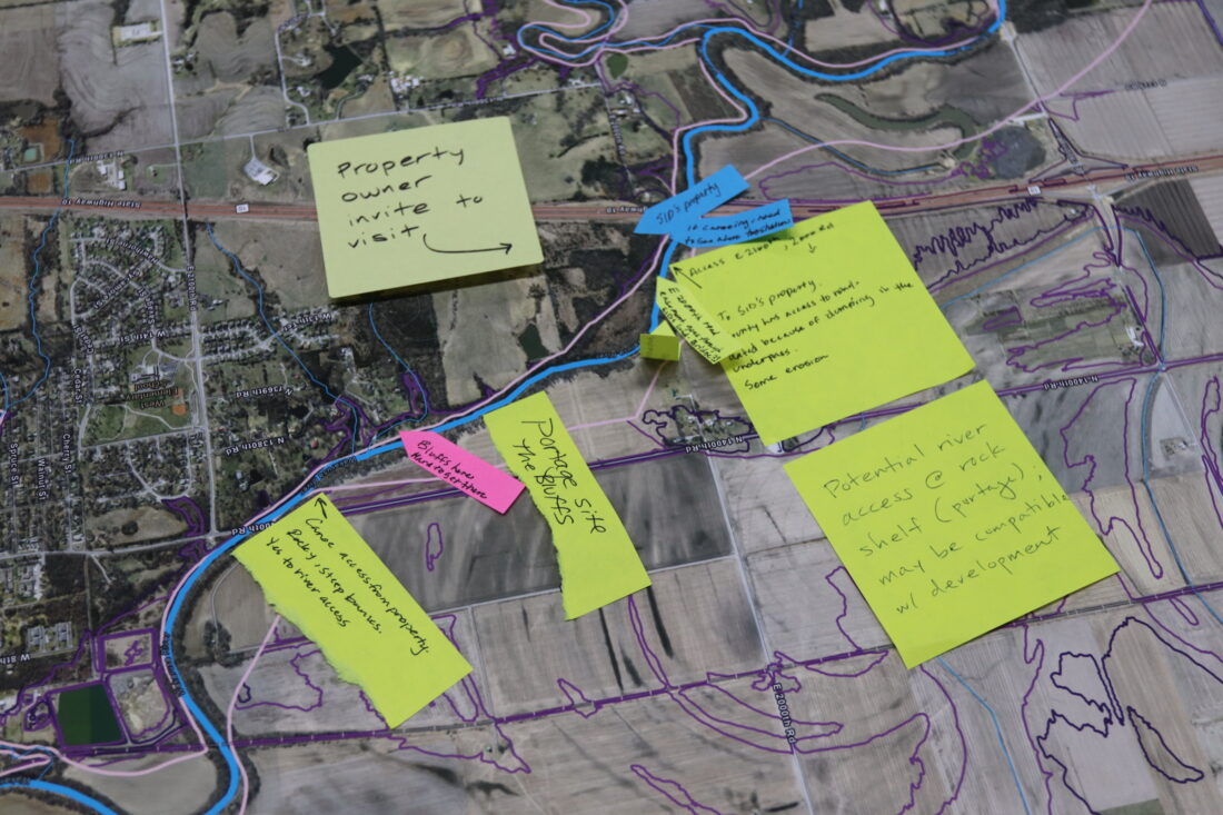 Community members were asked to engage with several boards around the room by placing Post-it notes with responses to questions like how they would like to see access to the river valley and what they envision the future of the area to be.