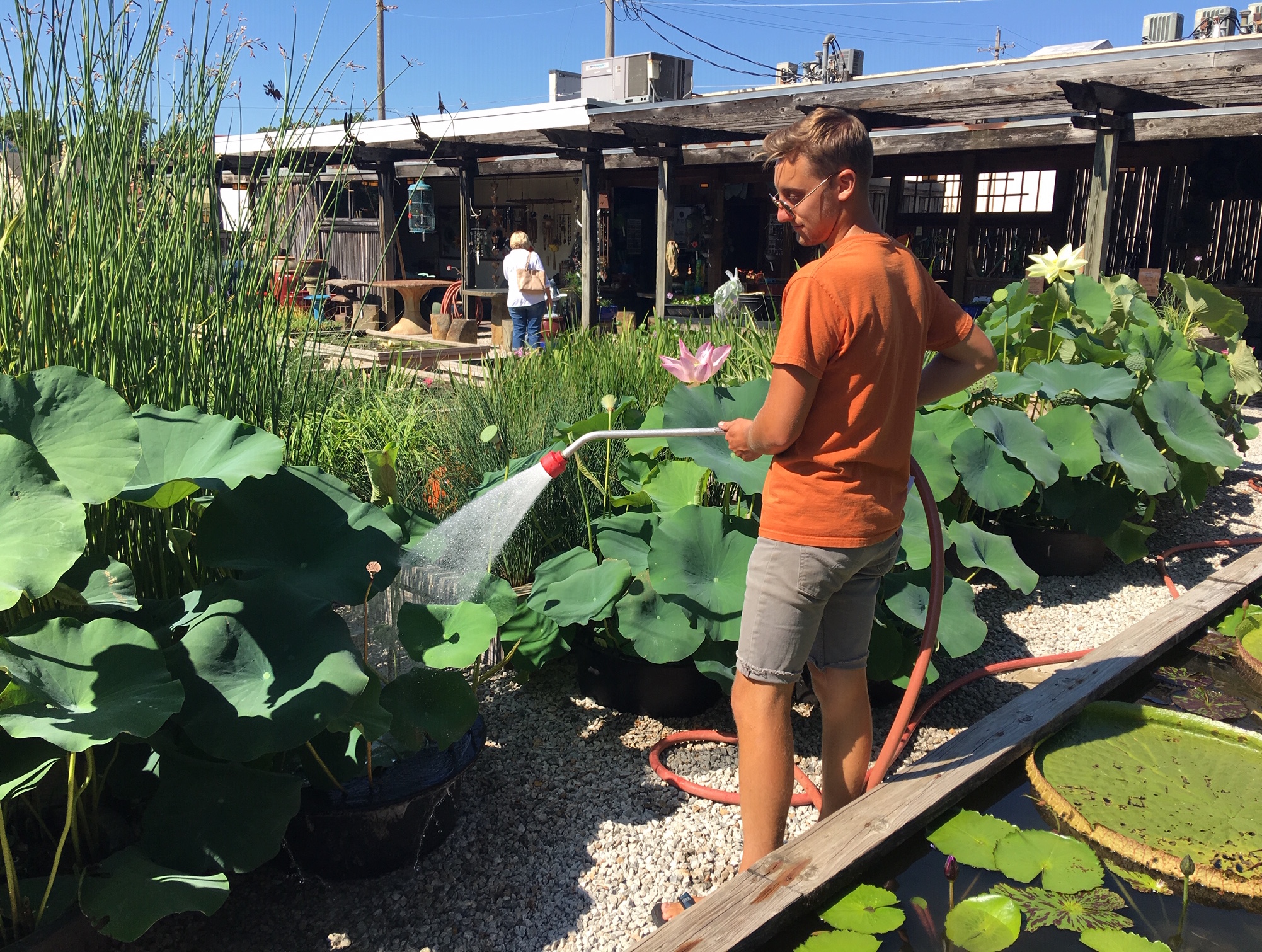 Water’s Edge employee Jon Lelek waters plants on Tuesday, July 23, 2019, at the store.